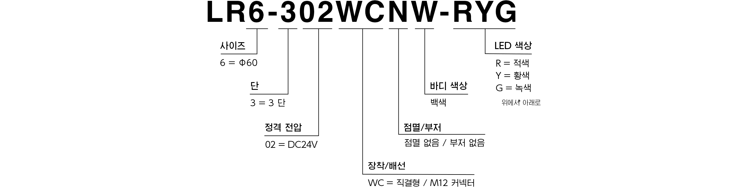 | LR6-302WCNW-RYG | 3 | DC24V | 직결 장착 / M12 커넥터 (M30 너트 장착 방식) |