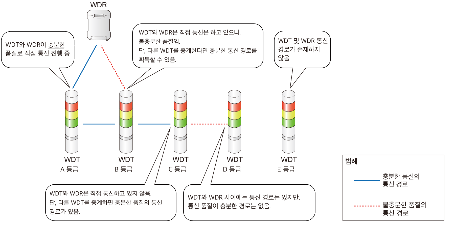| 1 | WDR 및 WDT의 설치 위치, 높이 및 방향을 조정합니다. | 주변의 물체가 무선 통신 전파를 방해하거나 반사합니다. 이때 WDR 및 WDT의 위치나 높이를 1m만 이동하면 통신 환경이 개선됩니다. |